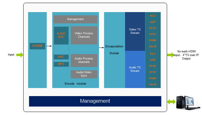 | IP Stream output | l For each HDMI in to IP output: 4*TS over IP stream out(HLS, RTMP, RTSP, HTTP, UDP, multicast/unicast, ONVIF, protocol).with 4 different resolutions (up to 1080p) and 4 different bitrates to meet different size screen and different bandwidth condition.