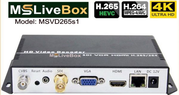 MSLiveBox IP video decoder (Model No. MSVD254S1) is a UHD audio and video decoding device with powerful functionality. It support H.265 /H.264 video decoding and AAC /MP3 /AC3 /AC3 audio decoding. It supports RTSP, HTTP, UDP, RTP, RTMP, HLS(M3U8), FLV, Multicast, Unicast etc streaming protocol decoding, HDMI and AV /RCA /CVBS and SDI and VGA output simultaneously. It supports up to 4K UHD video stream URL decoding. Its high integration and cost-effective design make this device widely used in variety of field such as advertisement or wall display or live broadcast etc.